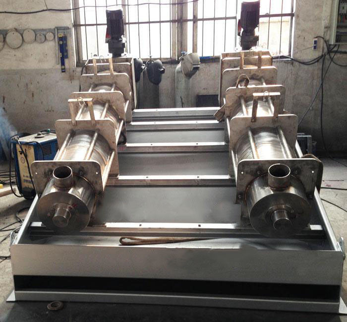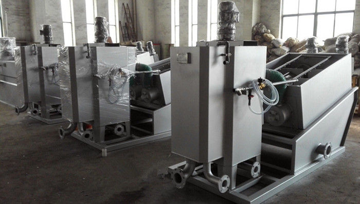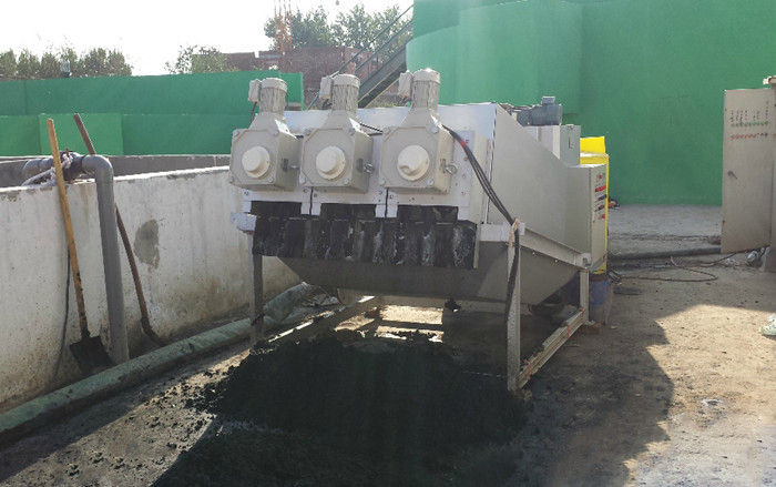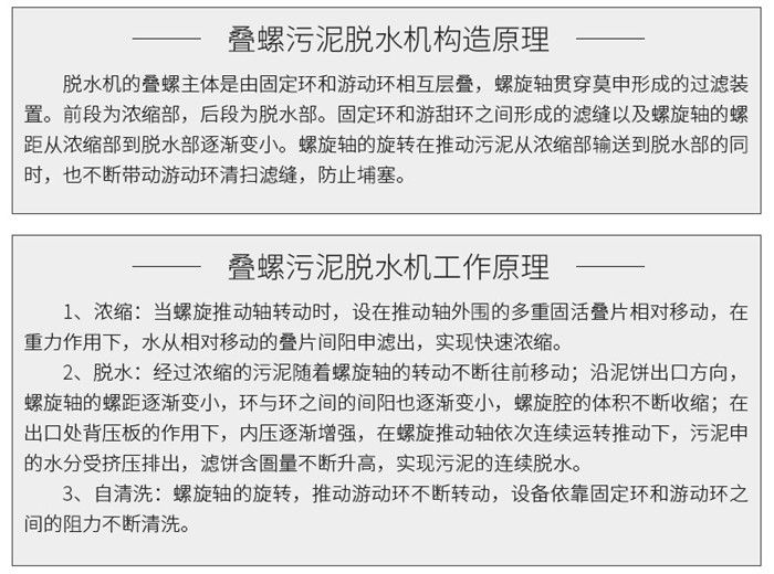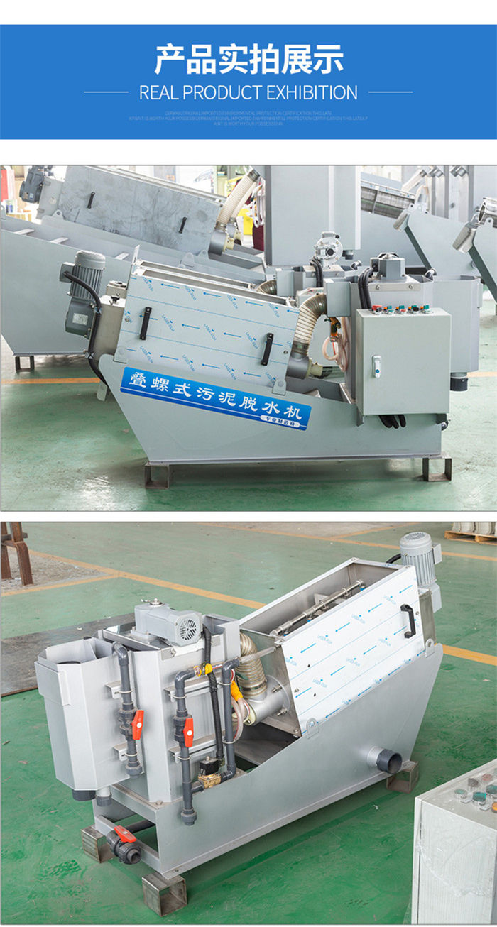 污泥通過泵,輸送至污泥槽,流至混合槽內(nèi),同時絮凝劑由加藥泵送至槽內(nèi),混合槽由液位控制,防止?jié)M溢。攪拌混合形成泛花,理想泛花象棉花狀,一朵朵的,然后流至過濾機(jī),液體透過動片與定片的間隙流出,固體通過螺旋旋轉(zhuǎn)不斷向前,在出口壓板的作用下充分脫水,至出口。